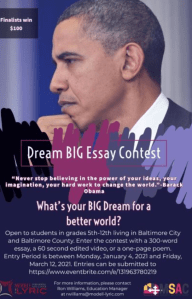 Patterson students are participating in the fourth “Dream Big” essay contest, hosted by the Model Lyric. In honor of President Barack Obama, the Modell Lyric is asking students to share the important dreams they have for their lives, communities, and families. Students in grades 5th-12th living in Baltimore City and Baltimore County are eligible to enter the contest with either a 300-word essay, a one-page poem, or a 60-second edited video. Between 5-10 selected finalists will have the opportunity to share their work and receive a $100 honorarium.